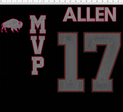 Customizations include: One sleeve (MVP), Allen, the number 17 and a buffalo. THIS DOES NOT INCLUDE A DESIGN ON THE FRONT OF THE SHIRT.