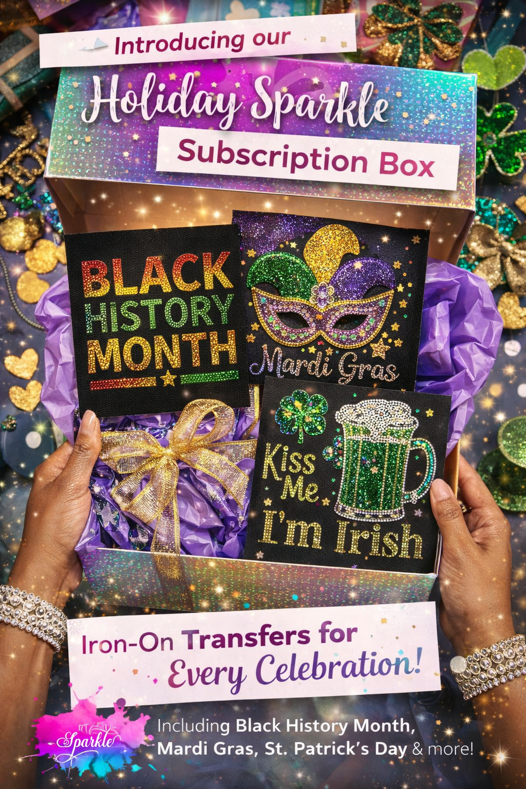 This exclusive subscription is designed for makers, designers, and sparkle lovers who want fresh, on-trend designs without the guesswork. Each month, you’ll receive five brand-new iron-on transfer appliqués curated around the upcoming holidays for the following month — including major celebrations, seasonal moments, and cultural highlights like Black History Month.